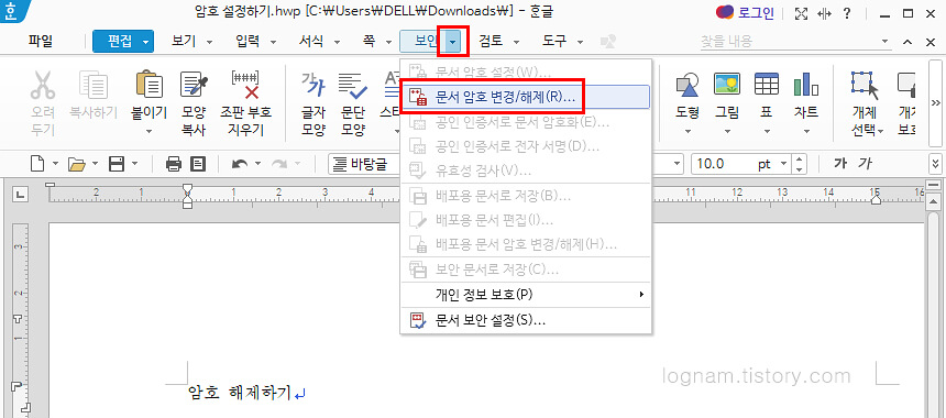 ▲ 보안 옆에 작은 화살표 클릭 -> 문서 암호 변경/해제