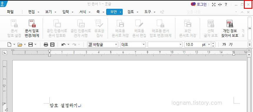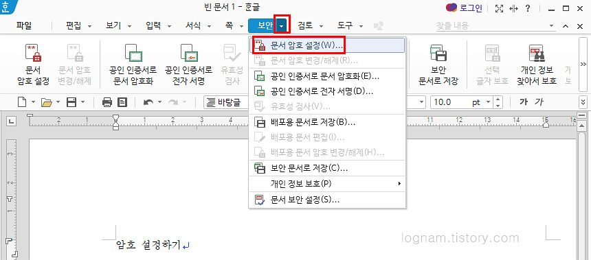 ▲ 보안 작은 화살표 클릭 -> 문서 암호 설정
