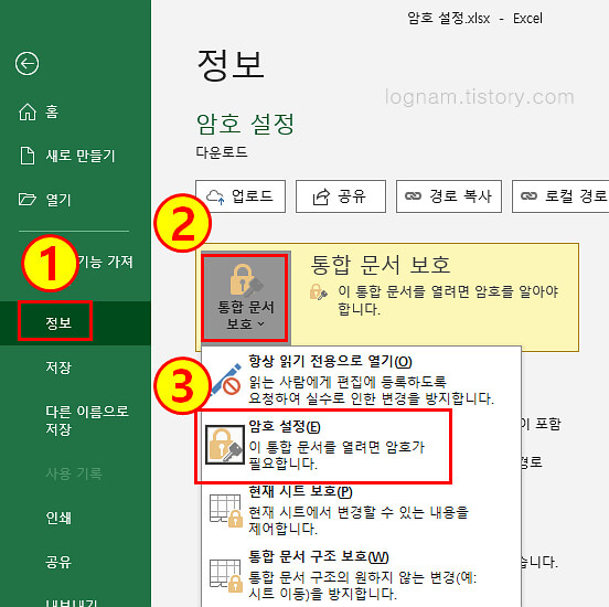 ▲ 정보 -> 통합문서 보호 -> 암호 설정