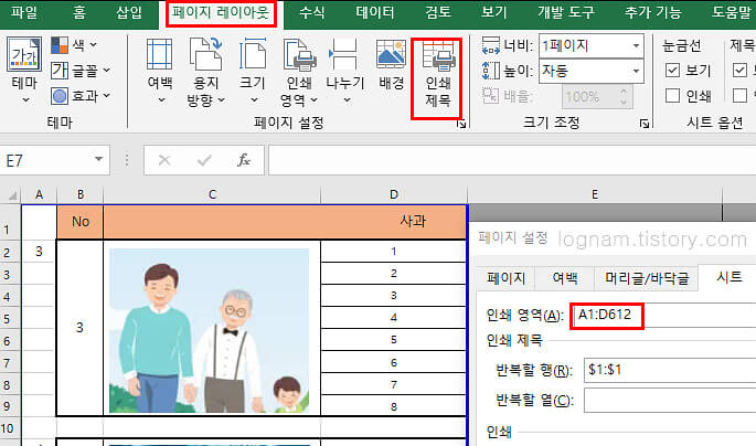 ▲ 인쇄 영역은 페이지 레이아웃 -> 인쇄 제목 -> 인쇄 영역으로 된 부분을 해제하는 기능입니다