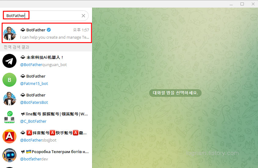 ▲ 텔레그램 검색창에 BotFather을 검색