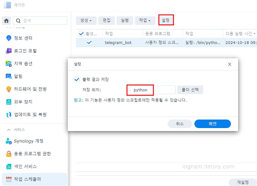 NAS서버에서 텔레그램 봇 이미지 예약 전송하기