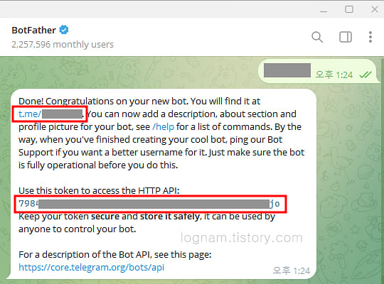 ▲ 텔레그램 봇 채팅방 주소와 토큰 API가 생성됩니다.