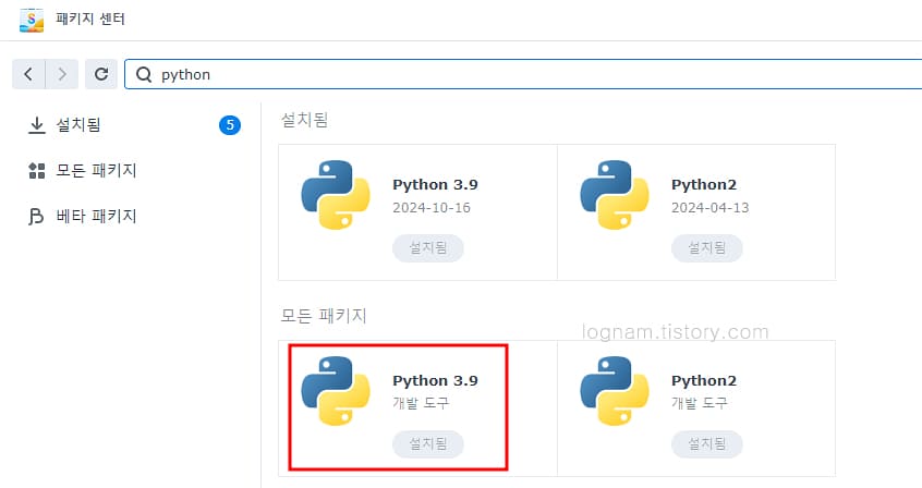 ▲ 패키지 센터에서 python을 검색하여 설치합니다.