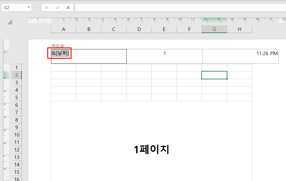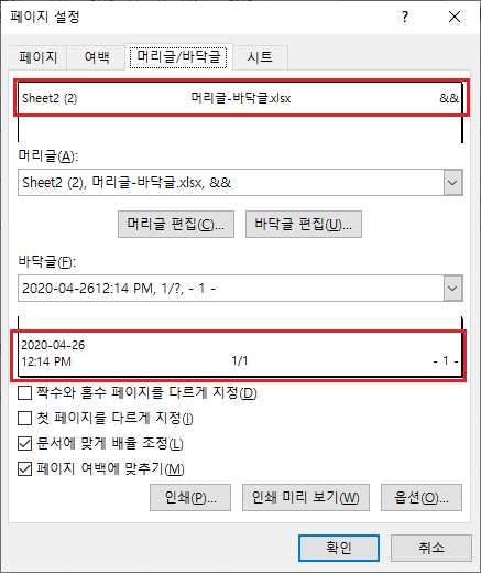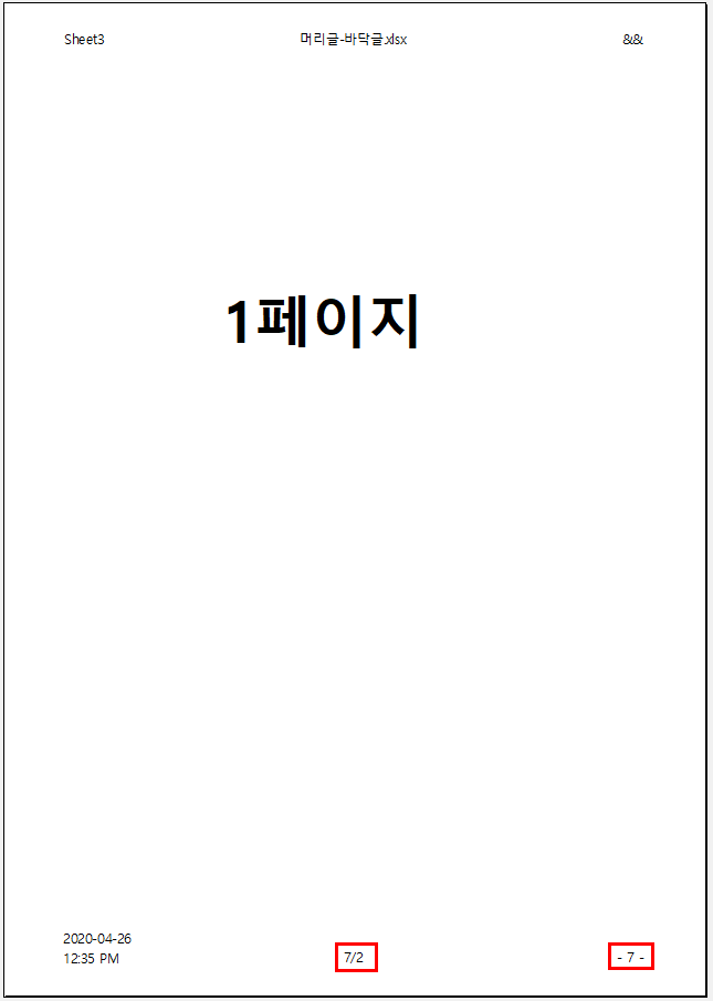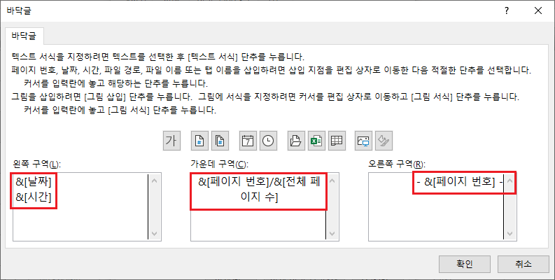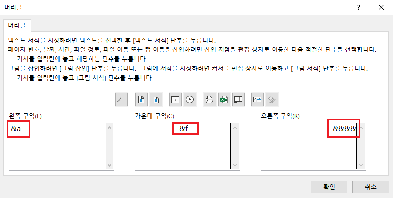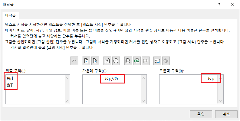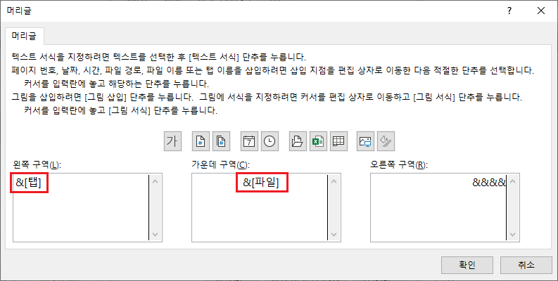 머리글/바닥글에 입력하면 표시되는 값입니다. 서식 코드로 입력해도 되고 입력 값으로 입력 해도 됩니다.