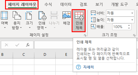페이지 레이아웃 -> 인쇄 제목을 누릅니다.