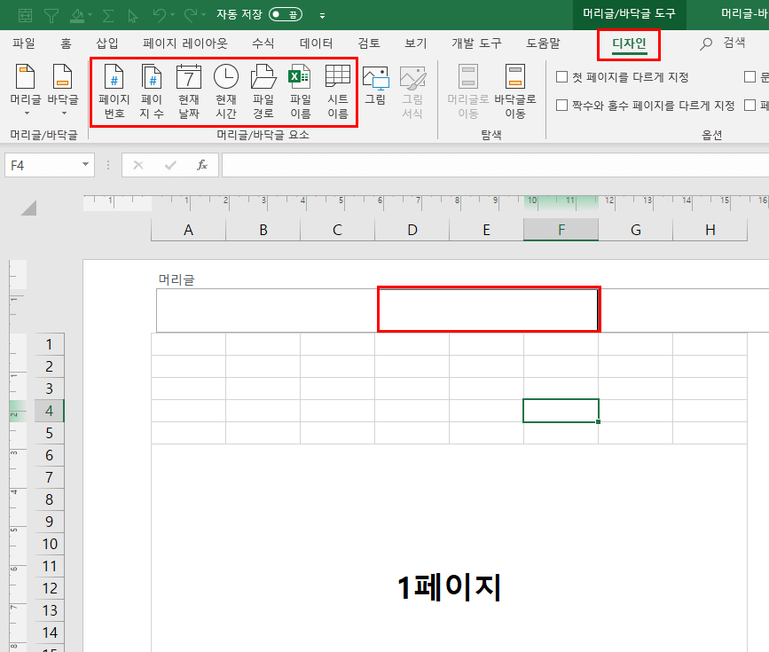 1. 우측 하단 페이지 레이아웃 클릭 -> 머리글의 입력쪽을 클릭 -> 디자인