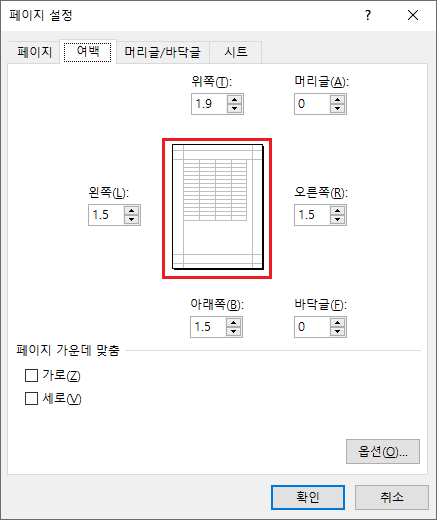 1. 페이지 레이아웃 -> 인쇄 제목 -> 여백 탭