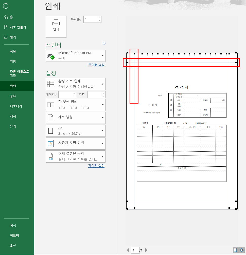 3. 인쇄 미리보기에서 우측 하단에 여백 표시를 클릭 선을 잡고 드래그