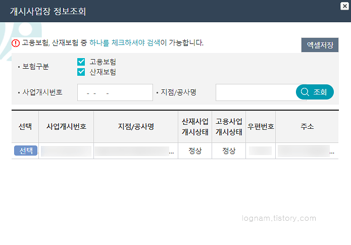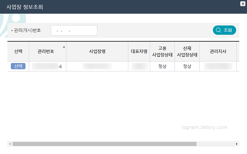 보험구분을 체크하고 사업장관리번호를 클릭합니다.