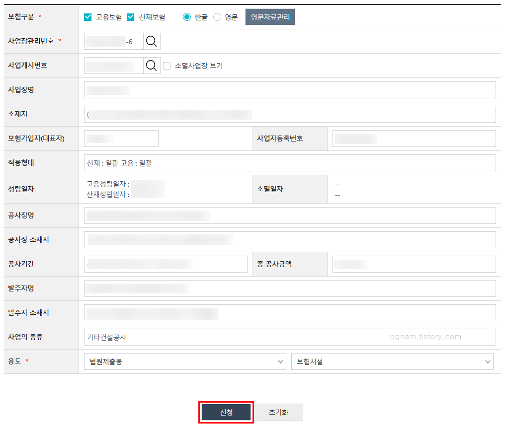 이제 모두 입력되었으니, 용도에 맞게 선택한 후 신청을 합니다.