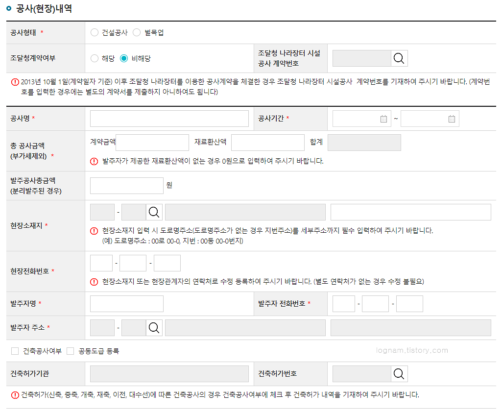 공사형태는 건설공사를 선택해주고, 나머지 빈칸들도 모두 채워줍니다. 계약금액에는 부가세 별도금액을 입력해야 하니 공급가만 적어주세요.