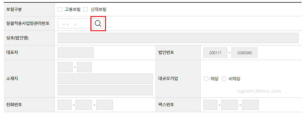 고용보험과 산재보험을 체크한 후에 일괄적용사업장관리번호의 돋보기 모양을 클릭합니다.