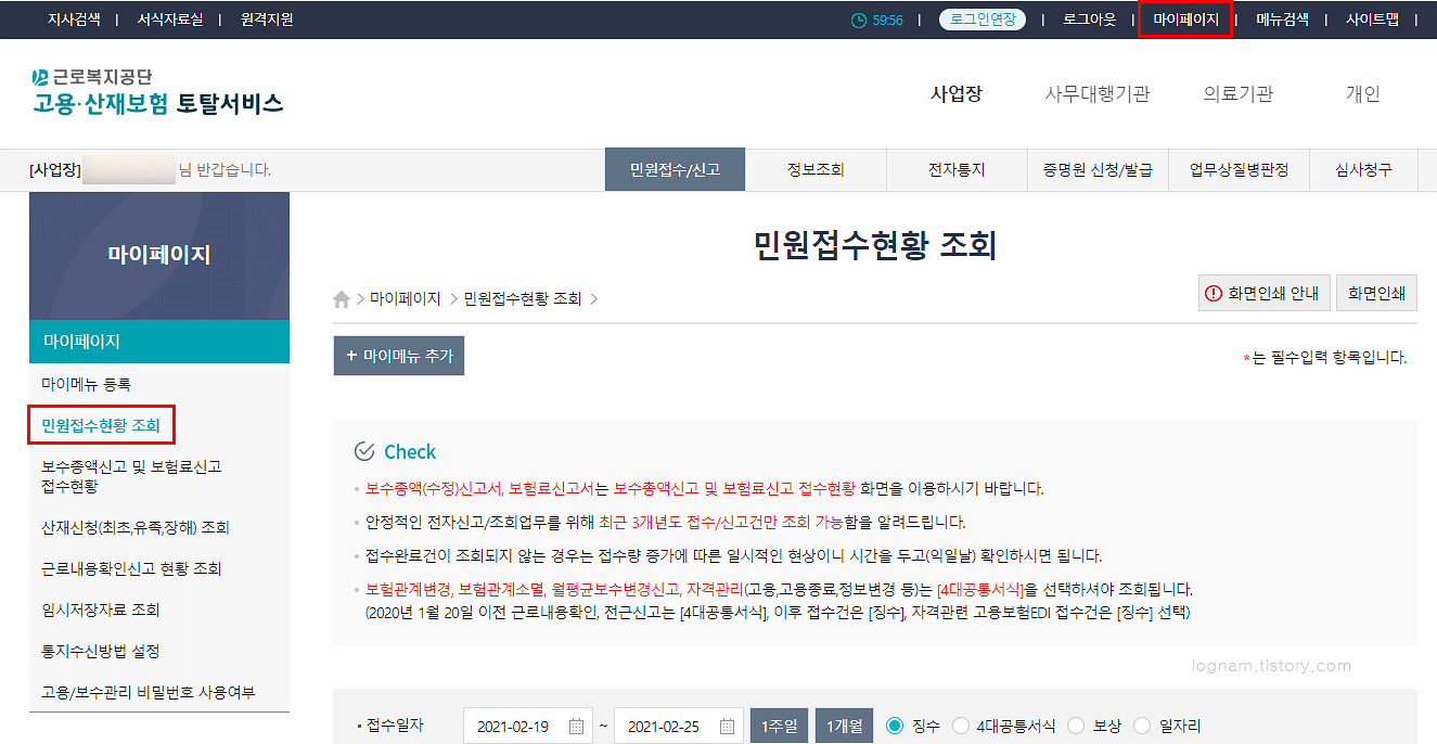 접수가 완료되었으면 마이페이지에서 민원접수현황 조회를 해봅니다.