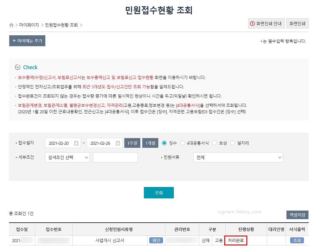 조회를 하면 접수번호가 나오고 진행상황이 나오는데요, 하루정도 지나면 처리완료가 됩니다. 미리 제출 일정을 알아서 준비하면 상관이 없지만, 급하게 서류요청이 왔을 때는 담당자에게 전화하여 접수번호를 불러주면서 사정을 얘기하면 빨리 처리해 주기도 합니다.
