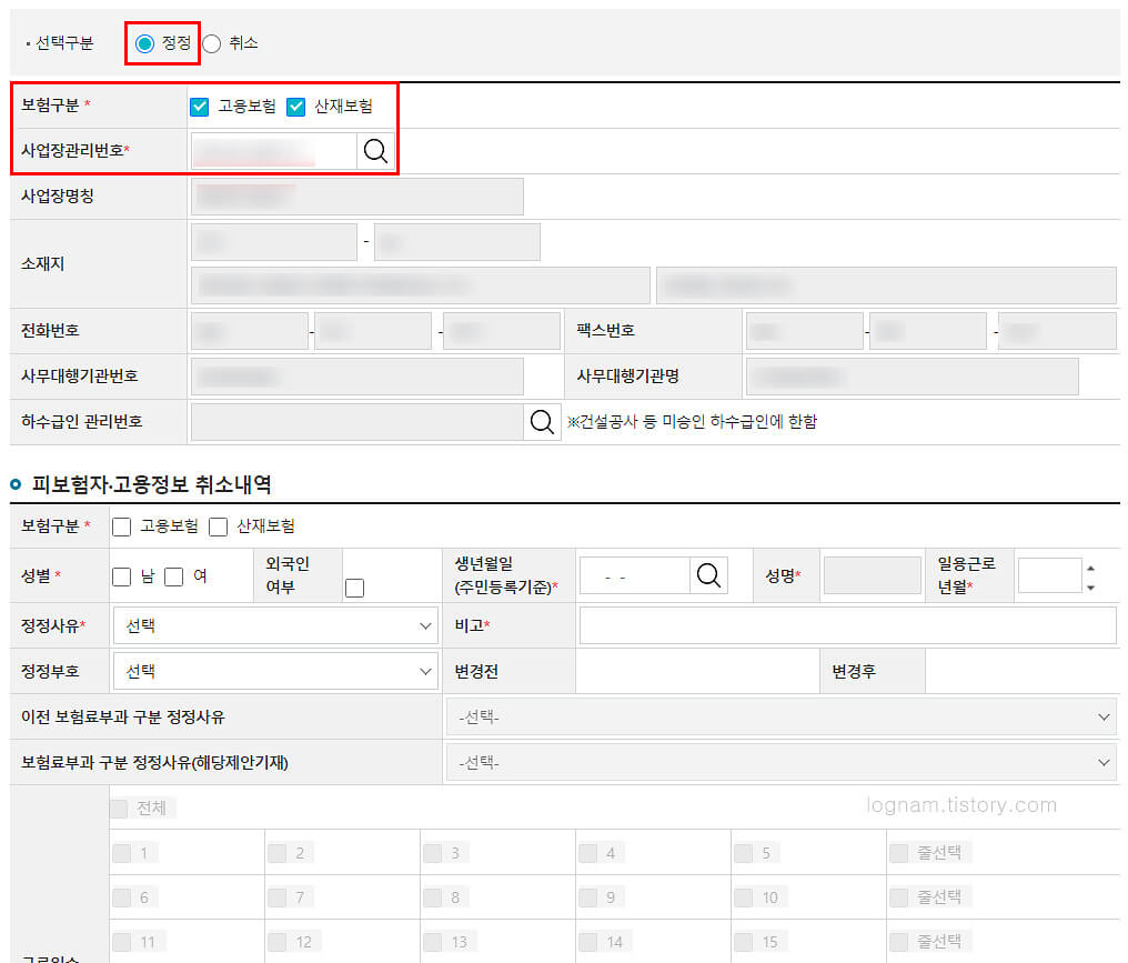 ▲ 취소하거나 정정하기가 있으나, 이번에는 정정하는 걸로 진행하겠습니다. 정정 선택 후 보험구분 체크 및 사업장관리번호를 입력해 주고 돋보기를 누르면 사업장 정보가 나옵니다.