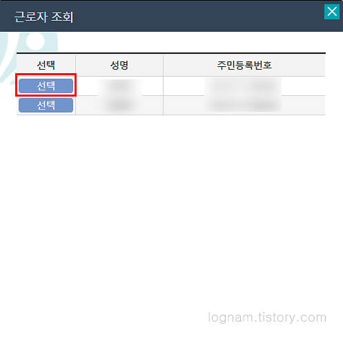 ▲ 돋보기를 누르면 근로자 정보조회 창이 나옵니다. 해당 근로자를 선택해줍니다.