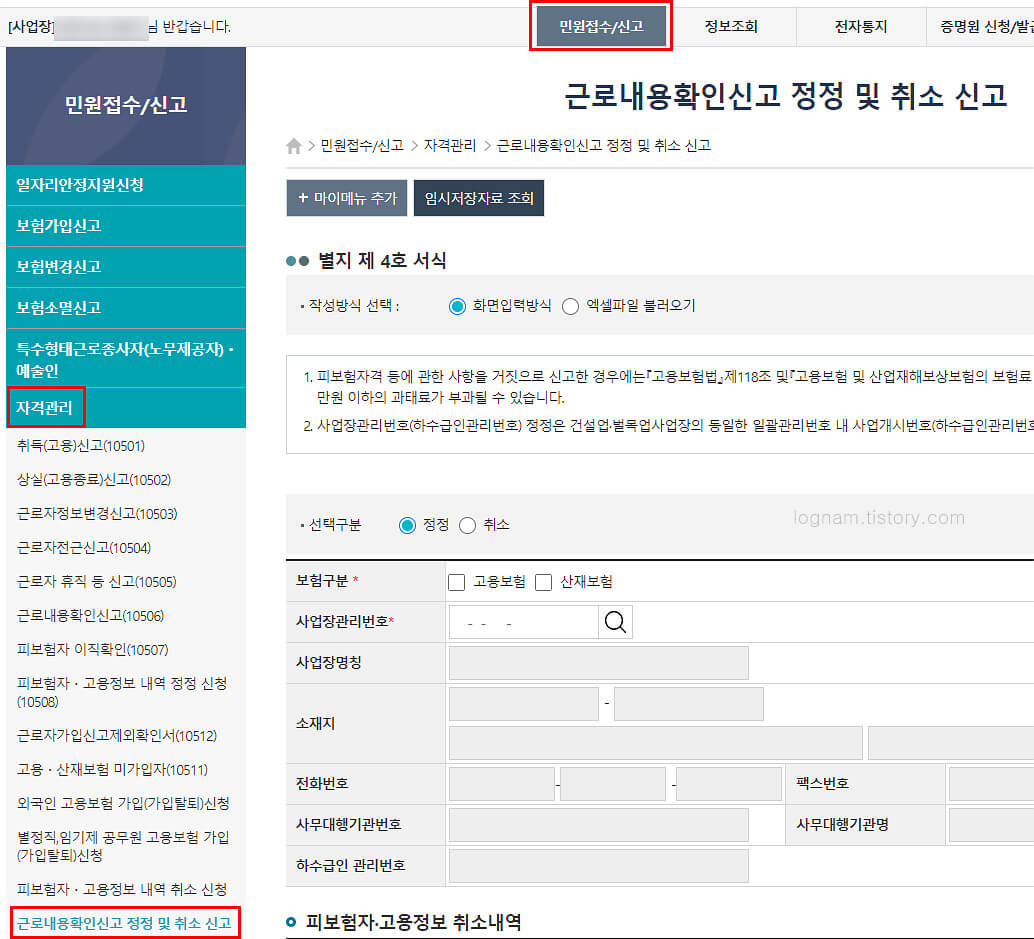 ▲ 민원접수 -> 자격관리 -> 근로내용확인신고 정정 및 취소 신고를 클릭해 줍니다.