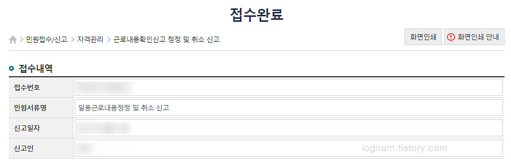 ▲ 이제 접수가 잘 되었는지 확인을 해보겠습니다. 마이페이지 -> 민원접수현황 조회 -> 조회를 클릭합니다. 일용근로내용정정 및 취소 신고가 접수되어 있는 것을 확인할 수 있습니다.