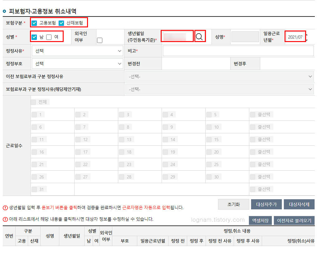 ▲ 다음으로 피 보험자.고용정보 취소내역에서 보험구분, 성별, 생년월일, 일용근로년월을 입력 후 생년월일의 돋보기를 클릭합니다.