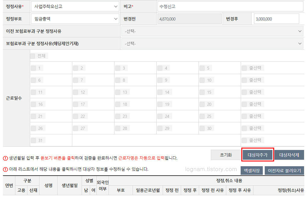 ▲ 그러면 아래 리스트에 수정한 내용이 추가가 됩니다. 보수총액(세후금액)도 같은 방식으로 대상자추가하여 줍니다. 만약에 근로일, 임금총액, 보수총액이 수정되어야 한다고 하면 한 사람당 3개의 리스트가 만들어지겠네요.