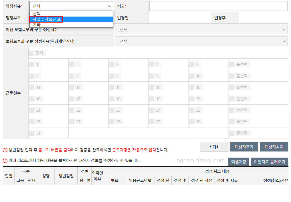 ▲ 정정사유에 사업주착오신고를 선택 후 비고란에도 '근로일 추가로 인한 근로일, 임금총액, 보수총액 수정' 등 수정 상황에 맞게 입력을 합니다.